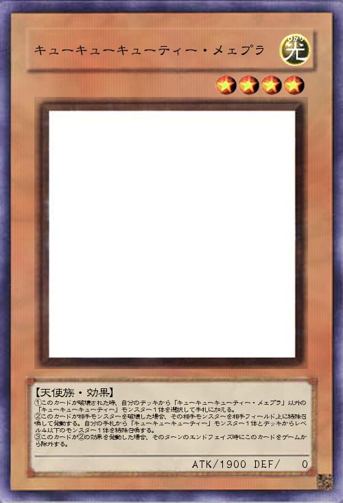 ①このカードが破壊された時、自分のデッキから「キューキューキューティー・メェプラ」以外の「キューキューキューティー」モンスター1体を選択して手札に加える。 ②このカードが相手モンスターを破壊した場合、その相手モンスターを相手フィールド上に特殊召喚して発動する。自分の手札から「キューキューキューティー」モンスター1体とデッキからレベル4以下のモンスター1体を特殊召喚する。 ③このカードが②の効果を発動した場合、そのターンのエンドフェイズ時にこのカードをゲームから除外する。 |
