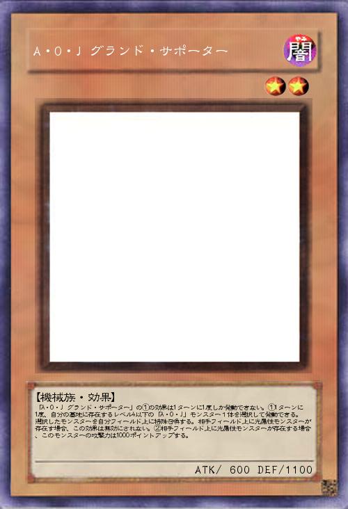 | 「A・O・J グランド・サポーター」の①の効果は1ターンに1度しか発動できない。①1ターンに1度、自分の墓地に存在するレベル4以下の「A・O・J」モンスター1体を選択して発動できる。選択したモンスターを自分フィールド上に特殊召喚する。相手フィールド上に光属性モンスターが存在す場合、この効果は無効にされない。②相手フィールド上に光属性モンスターが存在する場合、このモンスターの攻撃力は1000ポイントアップする。 | |||
