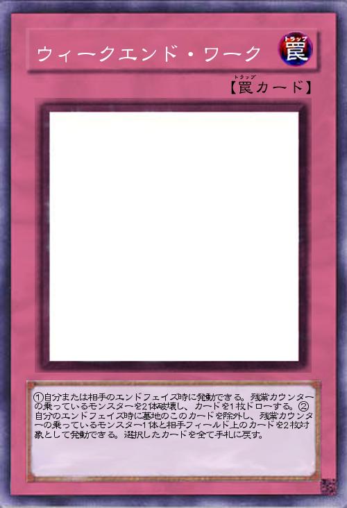 | ①自分または相手のエンドフェイズ時に発動できる。残業カウンターの乗っているモンスターを2体破壊し、カードを1枚ドローする。②自分のエンドフェイズ時に墓地のこのカードを除外し、残業カウンターの乗っているモンスター1体と相手フィールド上のカードを2枚対象として発動できる。選択したカードを全て手札に戻す。 | |||