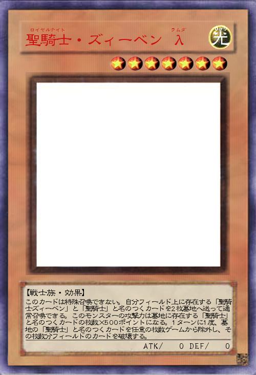 | このカードは特殊召喚できない。自分フィールド上に存在する「聖騎士ズィーベン」と「聖騎士」と名のつくカードを2枚墓地へ送って通常召喚できる。このモンスターの攻撃力は墓地に存在する「聖騎士」と名のつくカードの枚数×500ポイントになる。1ターンに1度、墓地の「聖騎士」と名のつくカードを任意の枚数ゲームから除外し、その枚数分フィールドのカードを破壊する。 | |||