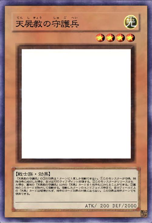 | 「天屍教の守護兵」の③の効果は1ターンに1度しか発動できない。①このモンスターが召喚、特殊召喚に成功した場合、自分は1000ライフポイント回復する。②このモンスターがリリースされた場合、墓地の「天屍教の守護兵」以外の「天屍」カードを1枚手札に加えることができる。③墓地のこのカードを除外して発動する。発動したターンのエンドフェイズ時まで、自分フィールド上の「天屍」カードは破壊されず、相手のカード効果の対象にならない。この効果は相手ターンでも使用できる。 | |||
