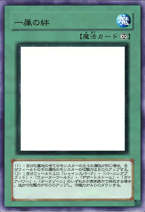 (1):自分の墓地の全てのモンスターの元々の属性が同じ場合、自分フィールドのその属性のモンスターの攻撃力は500アップする。 (2):自分フィールド上に「シャインスパーク」・「バーニングブラッド」・「ウォーターワールド」・「デザートストーム」・「ガイアパワー」・「ダークゾーン」のいずれかが表側表示で存在する場合、追加で攻撃力が500アップし、守備力が400ダウンする。 |