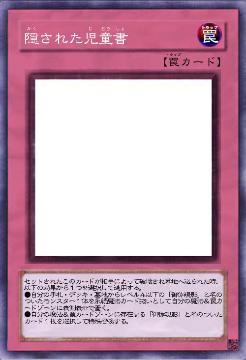 セットされたこのカードが相手によって破壊され墓地へ送られた時、以下の効果から1つを選択して適用する。 ●自分の手札・デッキ・墓地からレベル4以下の「御伽現影」と名のついたモンスター1体を永続魔法カード扱いとして自分の魔法&罠カードゾーンに表側表示で置く。 ●自分の魔法&罠カードゾーンに存在する「御伽現影」と名のついたカード1枚を選択して特殊召喚する。 |