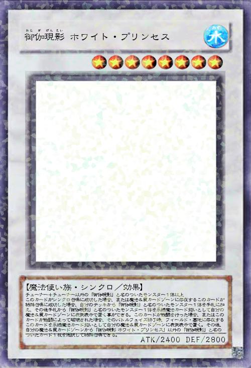 チューナー+チューナー以外の「御伽現影」と名のついたモンスター1体以上 このカードがシンクロ召喚に成功した場合、または魔法&罠カードゾーンに存在するこのカードが特殊召喚に成功した場合、自分のデッキから「御伽現影」と名のついたモンスター1体を手札に加え、その後手札から「御伽現影」と名のついたモンスター1体を永続魔法カード扱いとして自分の魔法&罠カードゾーンに表側表示で置く事ができる。このカードが戦闘を行った場合、またはこのカードが戦闘によって破壊された場合、そのバトルフェイズ終了時、フィールド・墓地に存在するこのカードを永続魔法カード扱いとして自分の魔法&罠カードゾーンに表側表示で置く。その後、自分の魔法&罠カードゾーンから「御伽現影 ホワイト・プリンセス」以外の「御伽現影」と名のついたカード1枚を選択して特殊召喚できる。 |