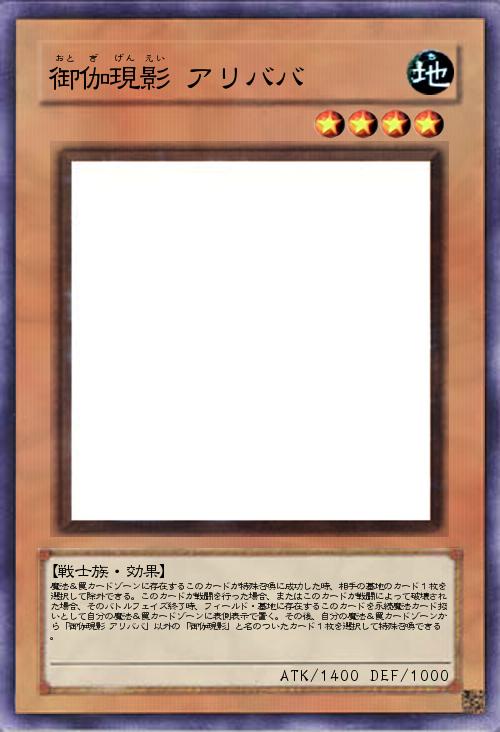 | 魔法&罠カードゾーンに存在するこのカードが特殊召喚に成功した時、相手の墓地のカード1枚を選択して除外できる。このカードが戦闘を行った場合、またはこのカードが戦闘によって破壊された場合、そのバトルフェイズ終了時、フィールド・墓地に存在するこのカードを永続魔法カード扱いとして自分の魔法&罠カードゾーンに表側表示で置く。その後、自分の魔法&罠カードゾーンから「御伽現影 アリババ」以外の「御伽現影」と名のついたカード1枚を選択して特殊召喚できる。 | |||