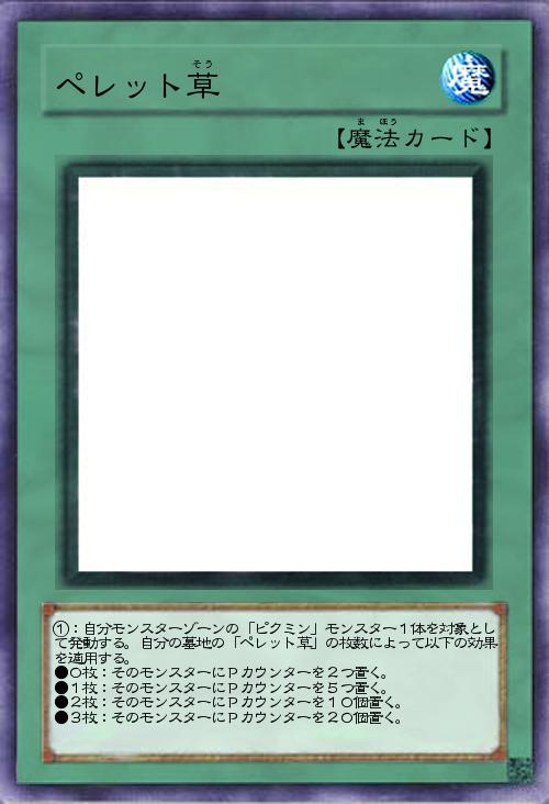①:自分モンスターゾーンの「ピクミン」モンスター1体を対象として発動する。自分の墓地の「ペレット草」の枚数によって以下の効果を適用する。 ●0枚:そのモンスターにPカウンターを2つ置く。 ●1枚:そのモンスターにPカウンターを5つ置く。 ●2枚:そのモンスターにPカウンターを10個置く。 ●3枚:そのモンスターにPカウンターを20個置く。 |