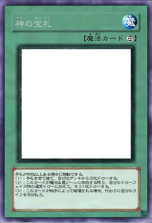 手札が四枚以上ある場合に発動できる。 (1):手札を全て捨て、自分はデッキから3枚ドローする。 (2):このカードが魔法&罠ゾーンに存在する限り、自分のドローフェイズ時の通常ドローに加えて、もう1枚ドローする。 (3):このカードが相手によって破壊される場合、代わりに自分のライフを半分払う。 |