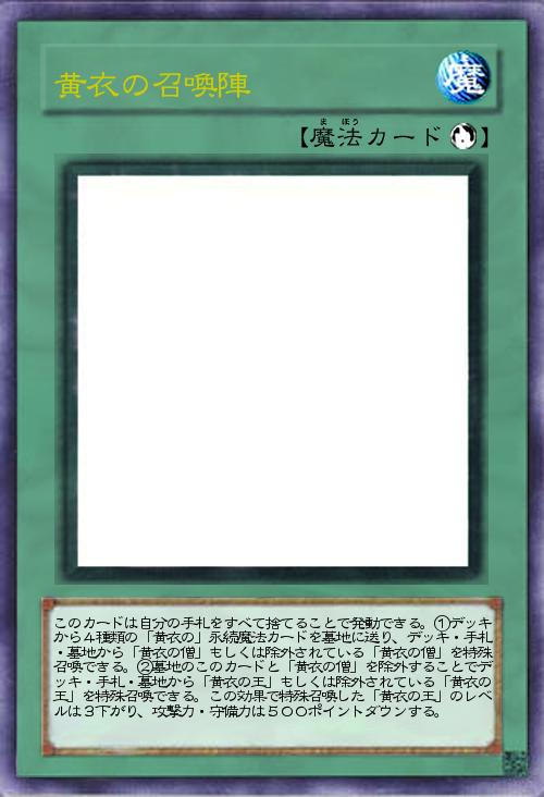| このカードは自分の手札をすべて捨てることで発動できる。①デッキから4種類の「黄衣の」永続魔法カードを墓地に送り、デッキ・手札・墓地から「黄衣の僧」もしくは除外されている「黄衣の僧」を特殊召喚できる。②墓地のこのカードと「黄衣の僧」を除外することでデッキ・手札・墓地から「黄衣の王」もしくは除外されている「黄衣の王」を特殊召喚できる。この効果で特殊召喚した「黄衣の王」のレベルは3下がり、攻撃力・守備力は500ポイントダウンする。 | |||