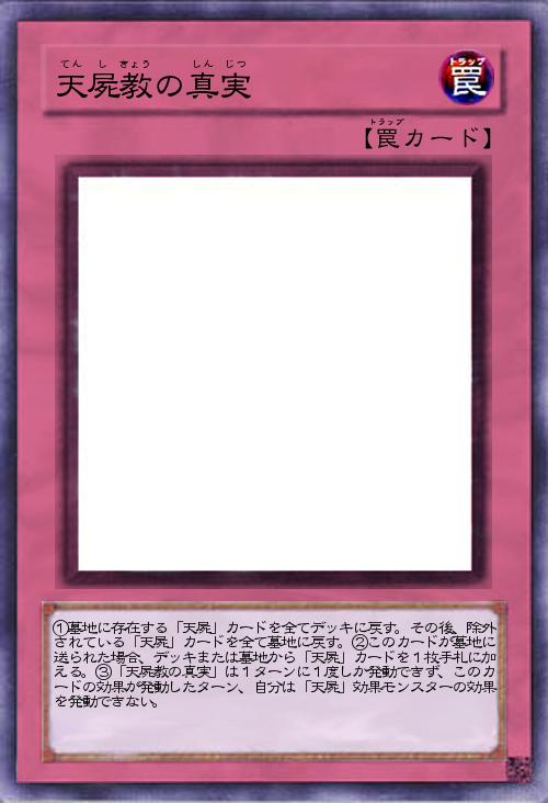 | ①墓地に存在する「天屍」カードを全てデッキに戻す。その後、除外されている「天屍」カードを全て墓地に戻す。②このカードが墓地に送られた場合、デッキまたは墓地から「天屍」カードを1枚手札に加える。③「天屍教の真実」は1ターンに1度しか発動できず、このカードの効果が発動したターン、自分は「天屍」効果モンスターの効果を発動できない。 | |||
