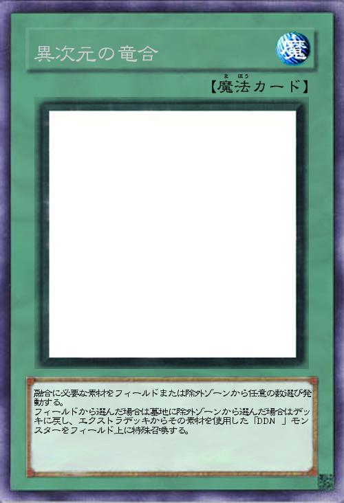 融合に必要な素材をフィールドまたは除外ゾーンから任意の数選び発動する。 フィールドから選んだ場合は墓地に除外ゾーンから選んだ場合はデッキに戻し、エクストラデッキからその素材を使用した「DDN 」モンスターをフィールド上に特殊召喚する。 |