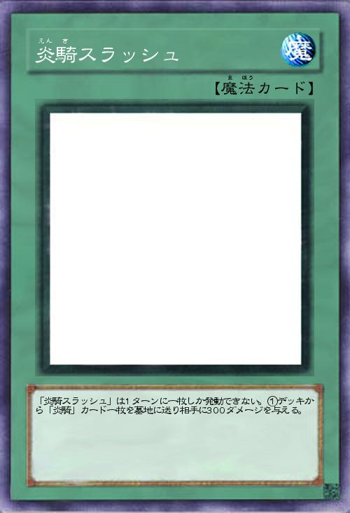 | 「炎騎スラッシュ」は1ターンに一枚しか発動できない。①デッキから「炎騎」カード一枚を墓地に送り相手に300ダメージを与える。 | |||