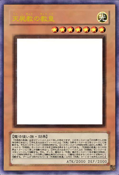 | 「天屍教の教皇」は自分フィールド上に1体しか存在できず、このモンスターは①の効果でしか特殊召喚できない。①手札または自分フィールド上の「天屍」効果モンスターを2体リリースして発動する。手札のこのモンスターを特殊召喚する。②このモンスターが特殊召喚に成功した場合、デッキから「天屍教」モンスターを2体まで特殊召喚することができる。「天屍教の教皇」のこの効果は1ターンに1度しか発動できない。③手札または自分フィールド上の「天屍教」モンスターを3体リリースして発動する。手札、デッキ、墓地から「天屍」儀式モンスター1体を儀式召喚扱いとして特殊召喚する。この効果と発動は無効にされない。④墓地に存在するこのカードを除外して発動する。ゲームから除外されている「天屍教の教皇」以外の「天屍」カードを1枚手札に加える。 | |||