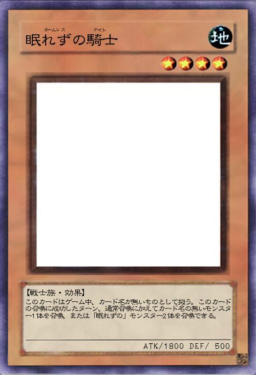 | このカードはゲーム中、カード名が無いものとして扱う。このカードの召喚に成功したターン、通常召喚に加えてカード名の無いモンスター1体を召喚、または「眠れずの」モンスター2体を召喚できる。 | |||
