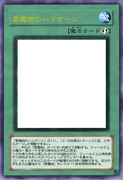 「雲魔物のハリケーン」の(1)、(2)の効果は1ターンに1度、どちらか1つしか発動できない。 (1):手札の「雲魔物」カードを1枚捨てて発動する。フィールド上の魔法・罠カードを全て持ち主の手札に戻す。 この効果で手札に戻したカードの枚数分だけ、フィールド上に表側表示で存在するモンスターにフォッグカウンターを乗せる。 (2):セットされたこのカードが破壊された時に発動できる。自分の手札または墓地から「雲魔物」モンスター1体を特殊召喚する。 |