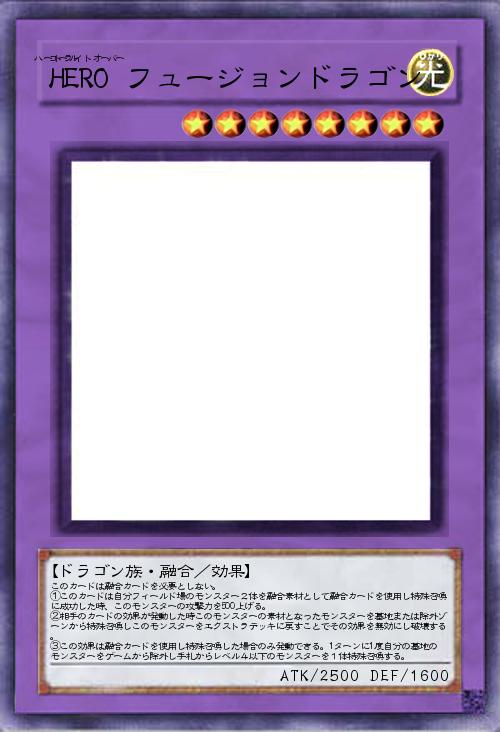 このカードは融合カードを必要としない。 ①このカードは自分フィールド場のモンスター2体を融合素材として融合カードを使用し特殊召喚に成功した時、このモンスターの攻撃力を500上げる。 ②相手のカードの効果が発動した時このモンスターの素材となったモンスターを墓地または除外ゾーンから特殊召喚しこのモンスターをエクストラデッキに戻すことでその効果を無効にし破壊する。 ③この効果は融合カードを使用し特殊召喚した場合のみ発動できる。1ターンに1度自分の墓地のモンスターをゲームから除外し手札からレベル4以下のモンスターを1体特殊召喚する。 |