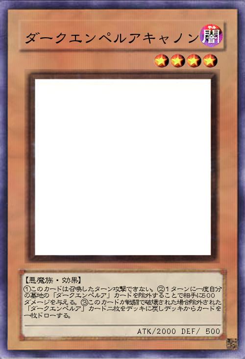 | ①このカードは召喚したターン攻撃できない。②1ターンに一度自分の墓地の「ダークエンペルア」カードを除外することで相手に500ダメージを与える。③このカードが戦闘で破壊された場合除外された「ダークエンペルア」カード二枚をデッキに戻しデッキからカードを一枚ドローする。 | |||