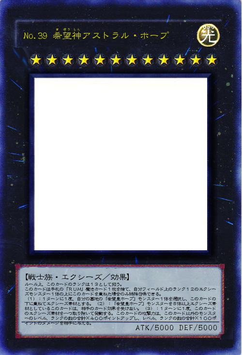 イメージは、遊馬によってエリファスが回心しなかった結果、アストラルがランクアップ至上主義となり、エリファスと同じくランクアップさせ続ける戦法を行い続け誕生したランク13のホープといった感じ。基本的にはアニメで使われそうな効果をイメージしてみた。OCGにランク12のエクシーズなんていないし。