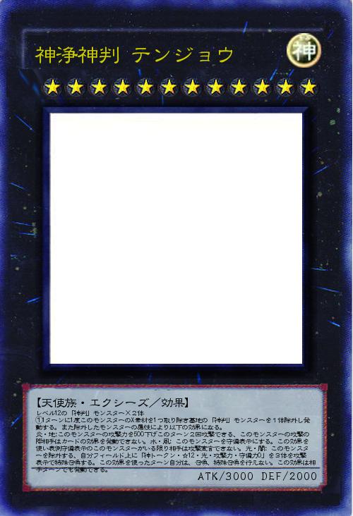 レベル12の「神判」モンスター×2体 ①1ターンに1度このモンスターのX素材を1つ取り除き墓地の「神判」モンスターを1体除外し発動する。また除外したモンスターの属性により以下の効果になる。 炎・地:このモンスターの攻撃力を500下げこのターン2回攻撃できる、このモンスターの攻撃の際相手はカードの効果を発動できない。水・風: このモンスターを守備表示にする。この効果を使い表側守備表示のこのモンスターがいる限り相手は攻撃宣言できない。光・闇: このモンスターを除外する、自分フィールド上に「神トークン・☆12・光・攻撃力・守備力0」を3体を攻撃表示で特殊召喚する。この効果を使ったターン自分は、召喚、特殊召喚を行えない。この効果は相手ターンでも発動できる。 |