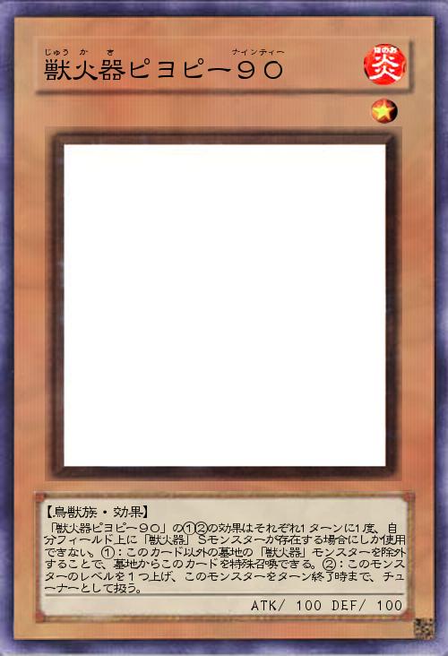 | 「獣火器ピヨピー90」の①②の効果はそれぞれ1ターンに1度、自分フィールド上に「獣火器」Sモンスターが存在する場合にしか使用できない。①:このカード以外の墓地の「獣火器」モンスターを除外することで、墓地からこのカードを特殊召喚できる。②:このモンスターのレベルを1つ上げ、このモンスターをターン終了時まで、チューナーとして扱う。 | |||