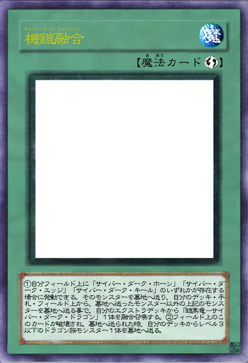 | ①自分フィールド上に「サイバー・ダーク・ホーン」「サイバー・ダーク・エッジ」「サイバー・ダーク・キール」のいずれかが存在する場合に発動できる。そのモンスターを墓地へ送り、自分のデッキ・手札・フィールド上から、墓地へ送ったモンスター以外の上記のモンスターを墓地へ送る事で、自分のエクストラデッキから「鎧黒竜-サイバー・ダーク・ドラゴン」1体を融合召喚する。②フィールド上のこのカードが破壊され、墓地へ送られた時、自分のデッキからレベル3以下のドラゴン族モンスター1体を墓地へ送る。 | |||