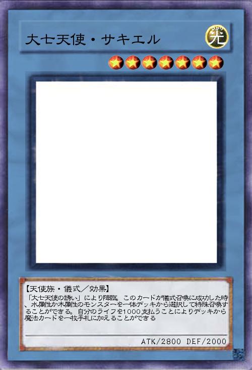 | 「大七天使の誘い」により降臨。このカードが儀式召喚に成功した時、水属性か木属性のモンスターを一体デッキから選択して特殊召喚することができる。自分のライフを1000支払うことによりデッキから魔法カードを一枚手札に加えることができる | |||