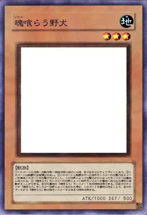 | ①このカードの召喚・反転召喚・特殊召喚に成功した時、自分は500ライフポイント失う。②このカードは戦闘では破壊されない。③このカードと戦闘を行った相手モンスターの攻撃力はダメージ計算後このカードの攻撃力分ダウンし、この効果によって攻撃力が0になったモンスターは墓地に送られる。④「魂喰らう」モンスターの効果によって相手モンスターが墓地へ送られた場合に発動することができる。自分の墓地の「魂喰らう」モンスター1枚を特殊召喚できる。⑤自分のライフが「魂喰らう」モンスター効果によって失われた場合、このカードを墓地に送ることで、自分のデッキから「魂喰らう」戦士族モンスターを2体まで特殊召喚する。 | |||
