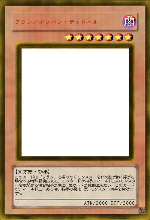 | このカードは「フラン」と名のつくモンスターを1体生け贄に捧げた場合のみ特殊召喚出来る。このカードが相手フィールド上のモンスターを攻撃する場合相手は魔法 罠カードは発動出来ない。このカードがフィールド上にある時、相手の魔法 罠 モンスター効果を無効にする | |||