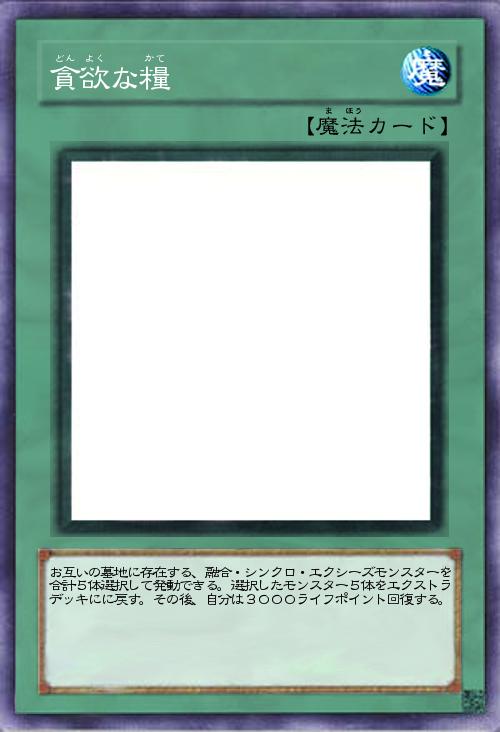 | お互いの墓地に存在する、融合・シンクロ・エクシーズモンスターを合計5体選択して発動できる。選択したモンスター5体をエクストラデッキにに戻す。その後、自分は3000ライフポイント回復する。 | |||