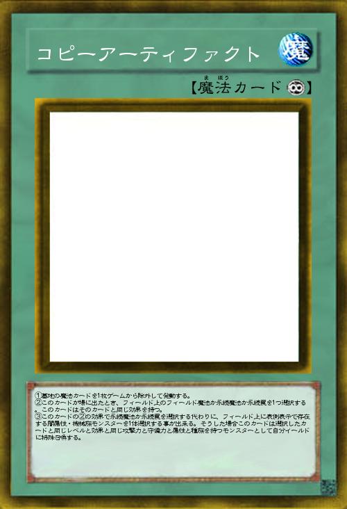 ①墓地の魔法カードを1枚ゲームから除外して発動する。 ②このカードが場に出たとき、フィールド上のフィールド魔法か永続魔法か永続罠を1つ選択する。このカードはそのカードと同じ効果を持つ。 ③このカードの②の効果で永続魔法か永続罠を選択する代わりに、フィールド上に表側表示で存在する闇属性・機械族モンスターを1体選択する事が出来る。そうした場合このカードは選択したカードと同じレベルと効果と同じ攻撃力と守備力と属性と種族を持つモンスターとして自分イールドに特殊召喚する。 |
