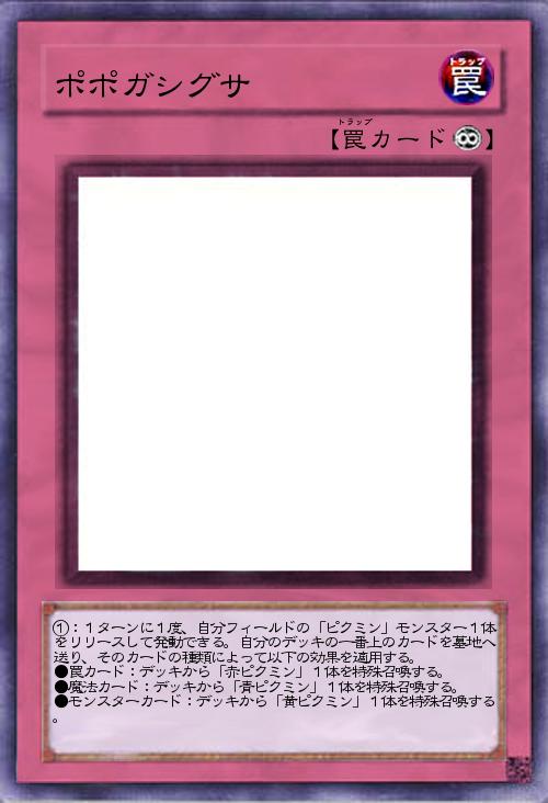 ①:1ターンに1度、自分フィールドの「ピクミン」モンスター1体をリリースして発動できる。自分のデッキの一番上のカードを墓地へ送り、そのカードの種類によって以下の効果を適用する。 ●罠カード:デッキから「赤ピクミン」1体を特殊召喚する。 ●魔法カード:デッキから「青ピクミン」1体を特殊召喚する。 ●モンスターカード:デッキから「黄ピクミン」1体を特殊召喚する。 |