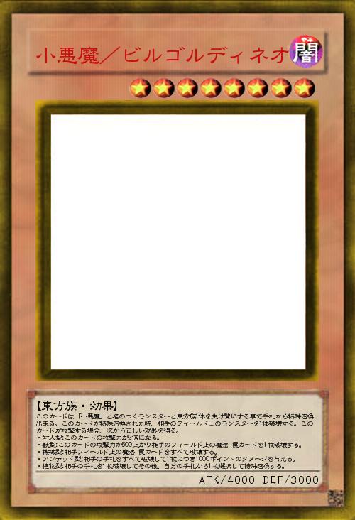 このカードは「小悪魔」と名のつくモンスターと東方族1体を生け贄にする事で手札から特殊召喚出来る。このカードが特殊召喚された時、相手のフィールド上のモンスターを1体破壊する。このカードが攻撃する場合、次から正しい効果を得る。 ・対人型:このカードの攻撃力が2倍になる。 ・獣型:このカードの攻撃力が500上がり相手のフィールド上の魔法 罠カードを1枚破壊する。 ・機械型:相手フィールド上の魔法 罠カードをすべて破壊する。 ・アンデッド型:相手の手札をすべて破壊して1枚につき1000ポイントのダメージを与える。 ・植物型:相手の手札を1枚破壊してその後、自分の手札から1枚選択して特殊召喚する。 |