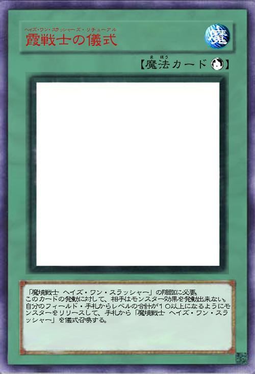 「魔境戦士 ヘイズ・ワン・スラッシャー」の降臨に必要。 このカードの発動に対して、相手はモンスター効果を発動出来ない。 自分のフィールド・手札からレベルの合計が10以上になるようにモンスターをリリースして、手札から「魔境戦士 ヘイズ・ワン・スラッシャー」を儀式召喚する。 |