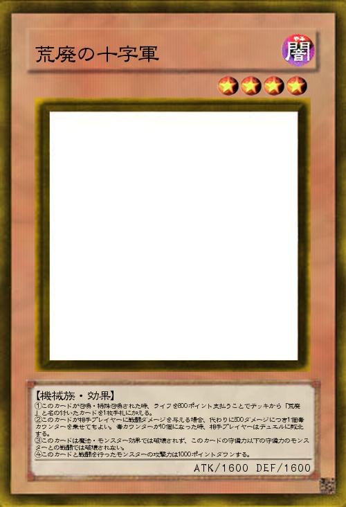 ①このカードが召喚・特殊召喚された時、ライフを800ポイント支払うことでデッキから「荒廃」と名の付いたカードを1枚手札に加える。 ②このカードが相手プレイヤーに戦闘ダメージを与える場合、代わりに500ダメージにつき1個毒カウンターを乗せてもよい。毒カウンターが10個になった時、相手プレイヤーはデュエルに敗北する。 ③このカードは魔法・モンスター効果では破壊されず、このカードの守備力以下の守備力のモンスターとの戦闘では破壊されない。 ④このカードと戦闘を行ったモンスターの攻撃力は1000ポイントダウンする。 |