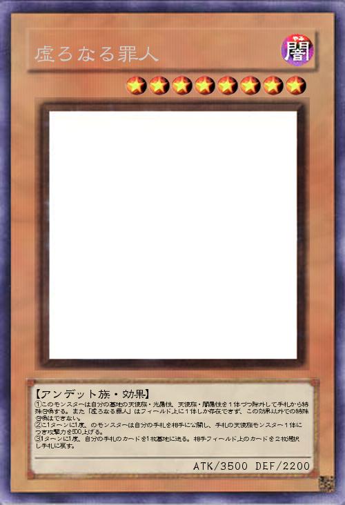 ①このモンスターは自分の墓地の天使族・光属性、天使族・闇属性を1体づつ除外して手札から特殊召喚する。また「虚ろなる罪人」はフィールド上に1体しか存在できず、この効果以外での特殊召喚はできない。 ②こ1ターンに1度、のモンスターは自分の手札を相手に公開し、手札の天使族モンスター1体につき攻撃力を500上げる。 ③1ターンに1度、自分の手札のカードを1枚墓地に送る。相手フィールド上のカードを2枚選択し手札に戻す。 |