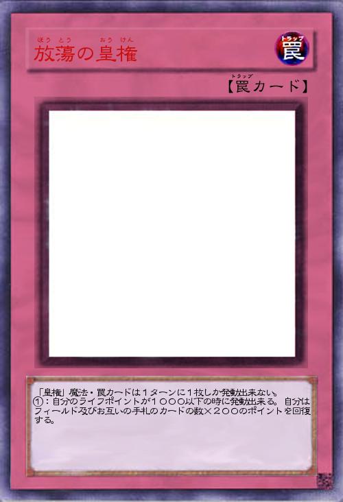「皇権」魔法・罠カードは1ターンに1枚しか発動出来ない。 ①:自分のライフポイントが1000以下の時に発動出来る。自分はフィールド及びお互いの手札のカードの数×200のポイントを回復する。 |