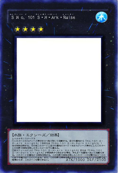 レベル4モンスター×3 ①このカードのエクシーズ素材を3つ取り除いて発動する。自分の墓地から「No.101 S・H・Ark Knight」1体または「CNo.101 S・H・Dark Knight」1体を特殊召喚する。その後このカードと自分の墓地のカード1枚をエクシーズ素材としてこのカードの効果で特殊召喚したモンスターの下に重ねる。 ②自分フィールド上に「No.101 S・H・Ark Knight」または「CNo.101 S・H・Dark Knight」が表側表示で存在する場合、手札を1枚墓地へ送って発動できる。このカードを墓地から特殊召喚する。この効果で特殊召喚したこのカードの攻撃力は2100になり守備力は1000になる。また、この効果で特殊召喚されたこのカードはカードの効果では破壊されず、このターン攻撃できない。 |