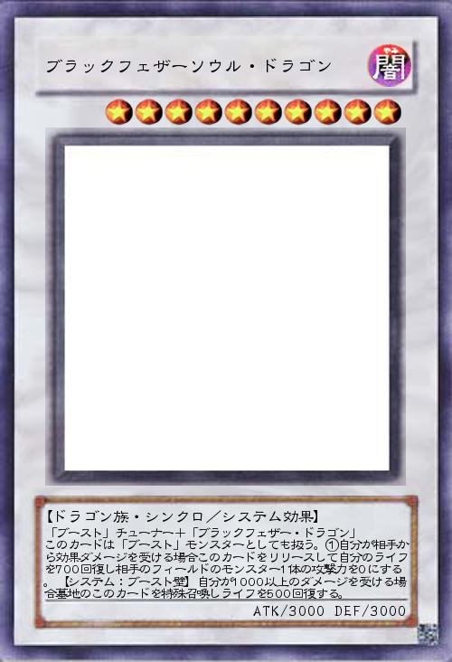 「ブースト」チューナー+「ブラックフェザー・ドラゴン」 このカードは「ブースト」モンスターとしても扱う。①自分が相手から効果ダメージを受ける場合このカードをリリースして自分のライフを700回復し相手のフィールドのモンスター1体の攻撃力を0にする。【システム:ブースト壁】自分が1000以上のダメージを受ける場合墓地のこのカードを特殊召喚しライフを500回復する。 |