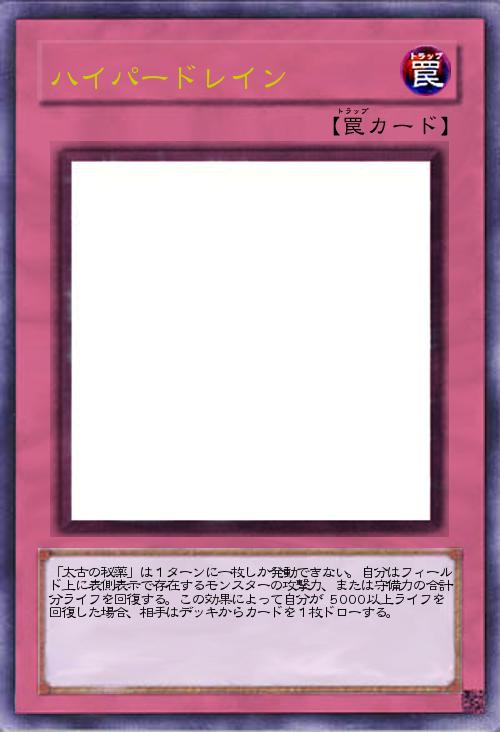 | 「太古の秘薬」は1ターンに一枚しか発動できない。自分はフィールド上に表側表示で存在するモンスターの攻撃力、または守備力の合計分ライフを回復する。この効果によって自分が 5000以上ライフを回復した場合、相手はデッキからカードを1枚ドローする。 | |||