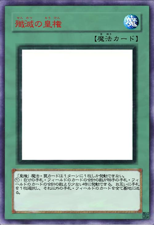 「皇権」魔法・罠カードは1ターンに1枚しか発動できない。 ①:自分の手札・フィールドのカードの合計の数が相手の手札・フィールドのカードの合計の数より少ない時に発動できる。お互いに手札を1枚選択し、それ以外の手札・フィールドのカードを全て墓地に送る。 |