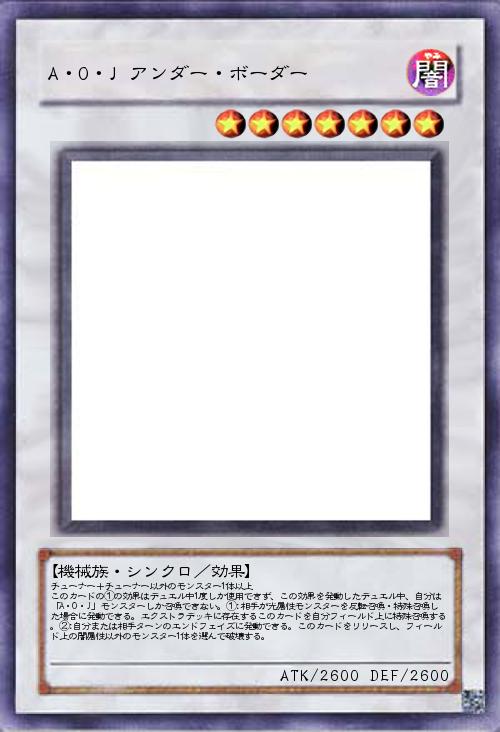 チューナー+チューナー以外のモンスター1体以上 このカードの①の効果はデュエル中1度しか使用できず、この効果を発動したデュエル中、自分は「A・O・J」モンスターしか召喚できない。①:相手が光属性モンスターを反転召喚・特殊召喚した場合に発動できる。エクストラデッキに存在するこのカードを自分フィールド上に特殊召喚する。②:自分または相手ターンのエンドフェイズに発動できる。このカードをリリースし、フィールド上の闇属性以外のモンスター1体を選んで破壊する。 |