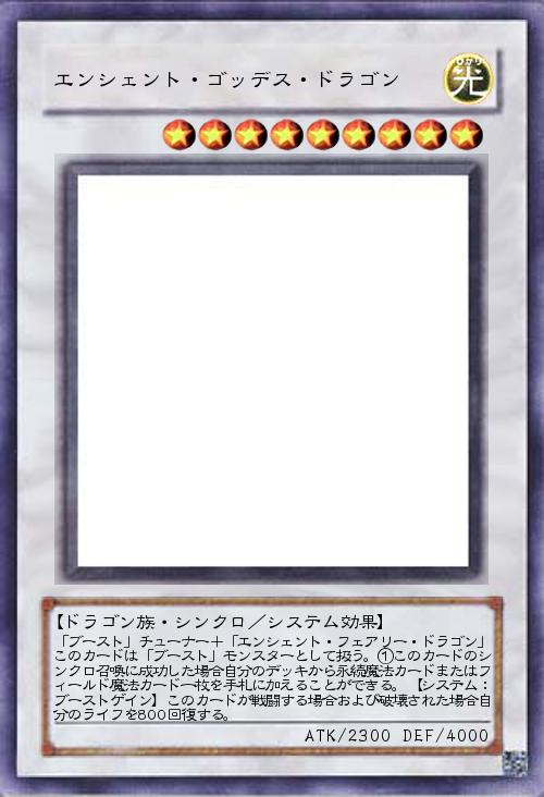 「ブースト」チューナー+「エンシェント・フェアリー・ドラゴン」 このカードは「ブースト」モンスターとして扱う。①このカードのシンクロ召喚に成功した場合自分のデッキから永続魔法カードまたはフィールド魔法カード一枚を手札に加えることができる。【システム:ブーストゲイン】このカードが戦闘する場合および破壊された場合自分のライフを800回復する。 |