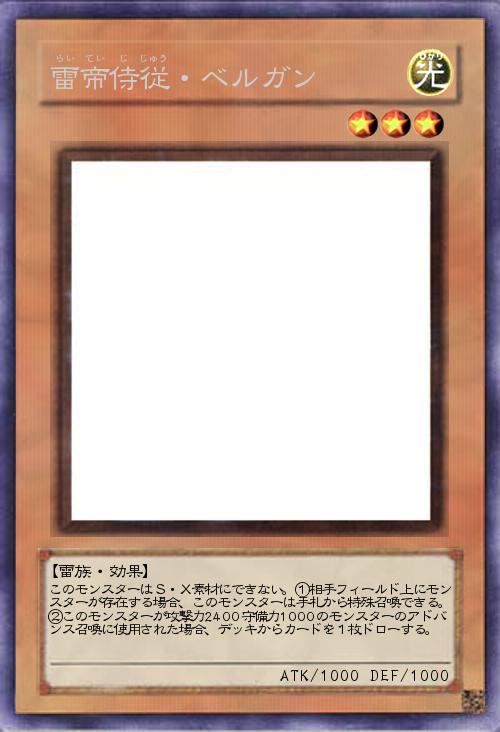| このモンスターはS・X素材にできない。①相手フィールド上にモンスターが存在する場合、このモンスターは手札から特殊召喚できる。②このモンスターが攻撃力2400守備力1000のモンスターのアドバンス召喚に使用された場合、デッキからカードを1枚ドローする。 | |||