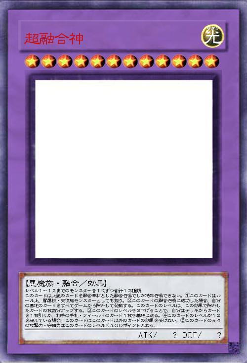 レベル1~12までのモンスター各1枚ずつ合計12種類 このカードは上記のカードを融合素材とした融合召喚でしか特殊召喚できない。①このカードはルール上、闇属性・天使族モンスターとしても扱う。②このカードの融合召喚に成功した場合、自分の墓地のカードをすべてゲームから除外して発動する。このカードのレベルは、この効果で除外したカードの枚数分アップする。③このカードのレベルを3下げることで、自分はデッキからカードを1枚引くか、相手の手札・フィールドのカード1枚を墓地に送る。④このカードのレベルが12を超えている場合、このカードはこのカード以外のカードの効果を受けない。⑤このカードの元々の攻撃力・守備力はこのカードのレベル×400ポイントとなる。 |