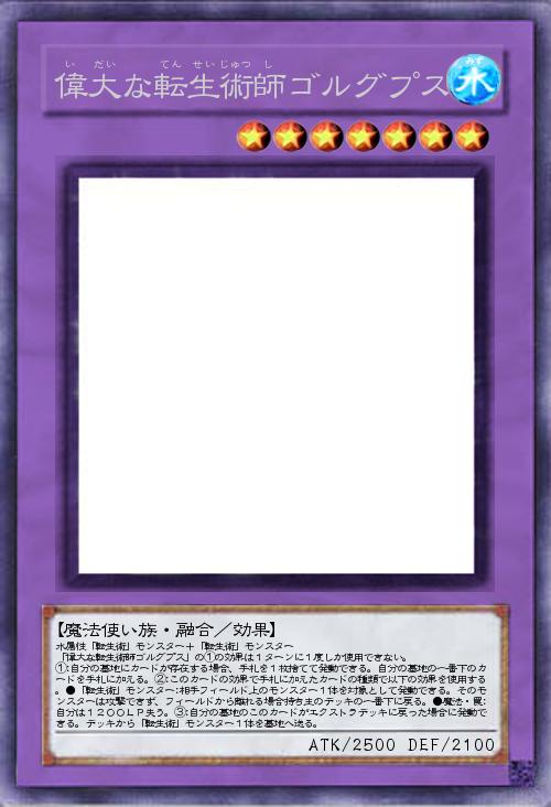 初の融合モンスター。「転生術」モンスターの効果で戻った場合、エクストラに戻ってしまい展開の妨げになるので③の効果を追加しました。でも展開力が落ちることには変わりないんだよなぁ…」(2014-09-10 13:30)