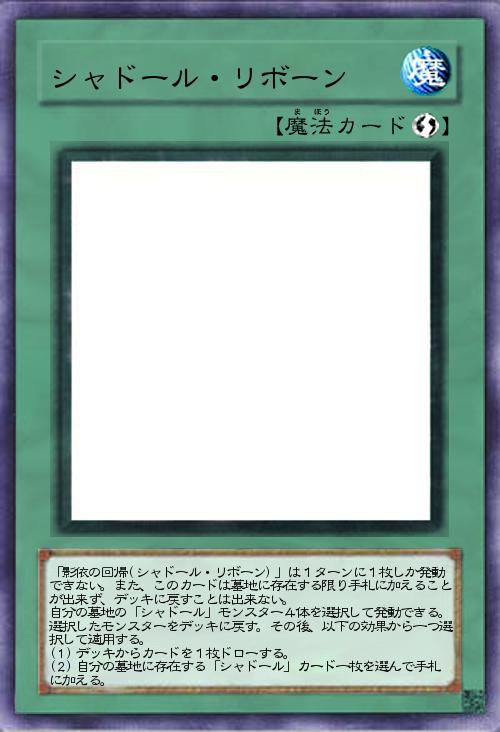 「影依の回帰(シャドール・リボーン)」は1ターンに1枚しか発動できない。また、このカードは墓地に存在する限り手札に加えることが出来ず、デッキに戻すことは出来ない。 自分の墓地の「シャドール」モンスター4体を選択して発動できる。選択したモンスターをデッキに戻す。その後、以下の効果から一つ選択して適用する。 (1)デッキからカードを1枚ドローする。 (2)自分の墓地に存在する「シャドール」カード一枚を選んで手札に加える。 |