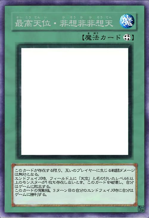 このカードが存在する限り、互いのプレイヤーに生じる戦闘ダメージは無効となる。 エンドフェイズ時、フィールド上に「天空」と名の付いたレベル5以上のモンスターが1枚も存在しないとき、このカードを破壊し、自分はゲームに敗北する。 このカードの発動後、3ターン目の自分のエンドフェイズ時に自分はゲームに勝利する。 |