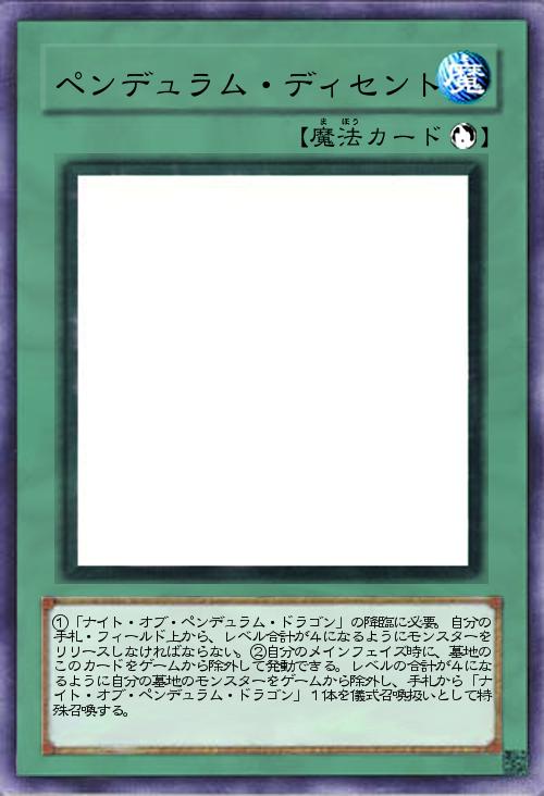| ①「ナイト・オブ・ペンデュラム・ドラゴン」の降臨に必要。自分の手札・フィールド上から、レベル合計が4になるようにモンスターをリリースしなければならない。②自分のメインフェイズ時に、墓地のこのカードをゲームから除外して発動できる。レベルの合計が4になるように自分の墓地のモンスターをゲームから除外し、手札から「ナイト・オブ・ペンデュラム・ドラゴン」1体を儀式召喚扱いとして特殊召喚する。 | |||