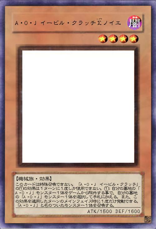 | このカードは特殊召喚できない。「A・O・J イービル・クラッチ」の①の効果は1ターンに1度しか使用できない。①:自分の墓地の「A・O・J」モンスター1体をゲームから除外する事で、自分の墓地の「A・O・J」モンスター1体を選択して手札に加える。また、この効果を適用したターンのメインフェイズ時に1度だけ発動できる。「A・O・J」と名のついたモンスター1体を召喚する。 | |||