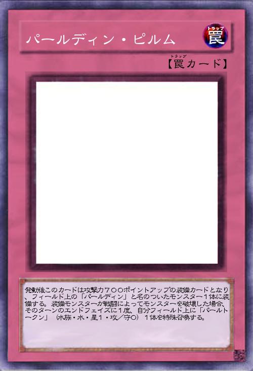 | 発動後このカードは攻撃力700ポイントアップの装備カードとなり、フィールド上の「パールディン」と名のついたモンスター1体に装備する。装備モンスターが戦闘によってモンスターを破壊した場合、そのターンのエンドフェイズに1度、自分フィールド上に「パールトークン」(水族・水・星1・攻/守0)1体を特殊召喚する。 | |||
