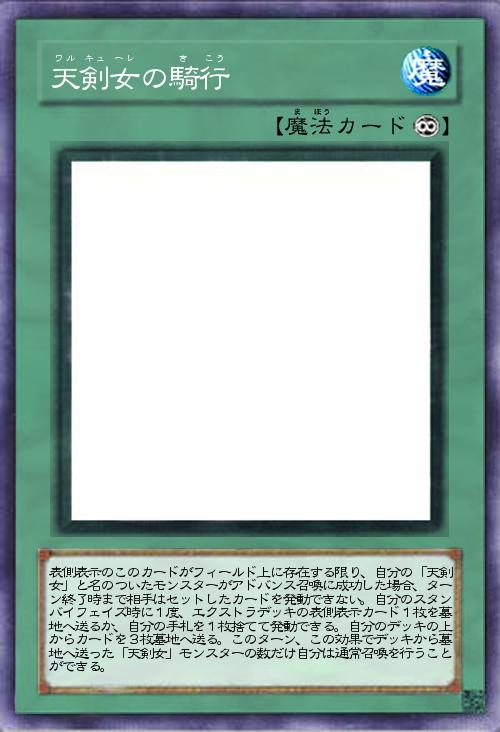 | 表側表示のこのカードがフィールド上に存在する限り、自分の「天剣女」と名のついたモンスターがアドバンス召喚に成功した場合、ターン終了時まで相手はセットしたカードを発動できない。自分のスタンバイフェイズ時に1度、エクストラデッキの表側表示カード1枚を墓地へ送るか、自分の手札を1枚捨てて発動できる。自分のデッキの上からカードを3枚墓地へ送る。このターン、この効果でデッキから墓地へ送った「天剣女」モンスターの数だけ自分は通常召喚を行うことができる。 | |||